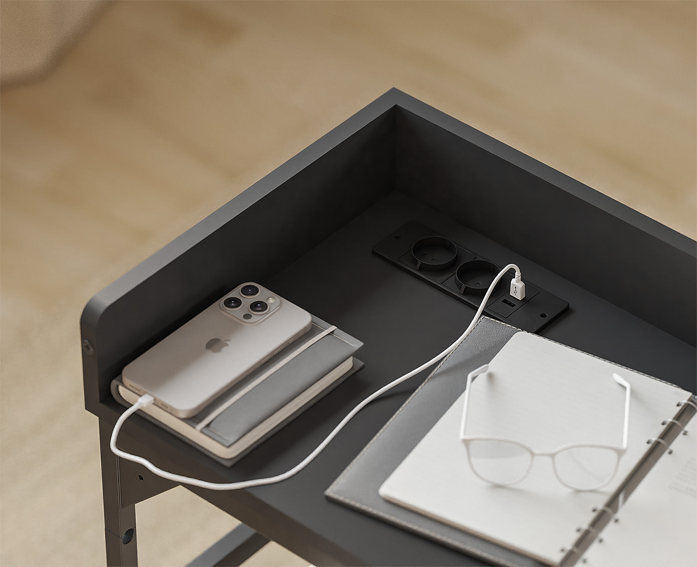 Steek de stekker van DreamDesk in een normaal wandstopcontact en je kunt direct je laptop, telefoon, tablet of verlichting aansluiten. Zo heb je alle stroompunten binnen handbereik, zonder losse verlengsnoeren door de kamer.